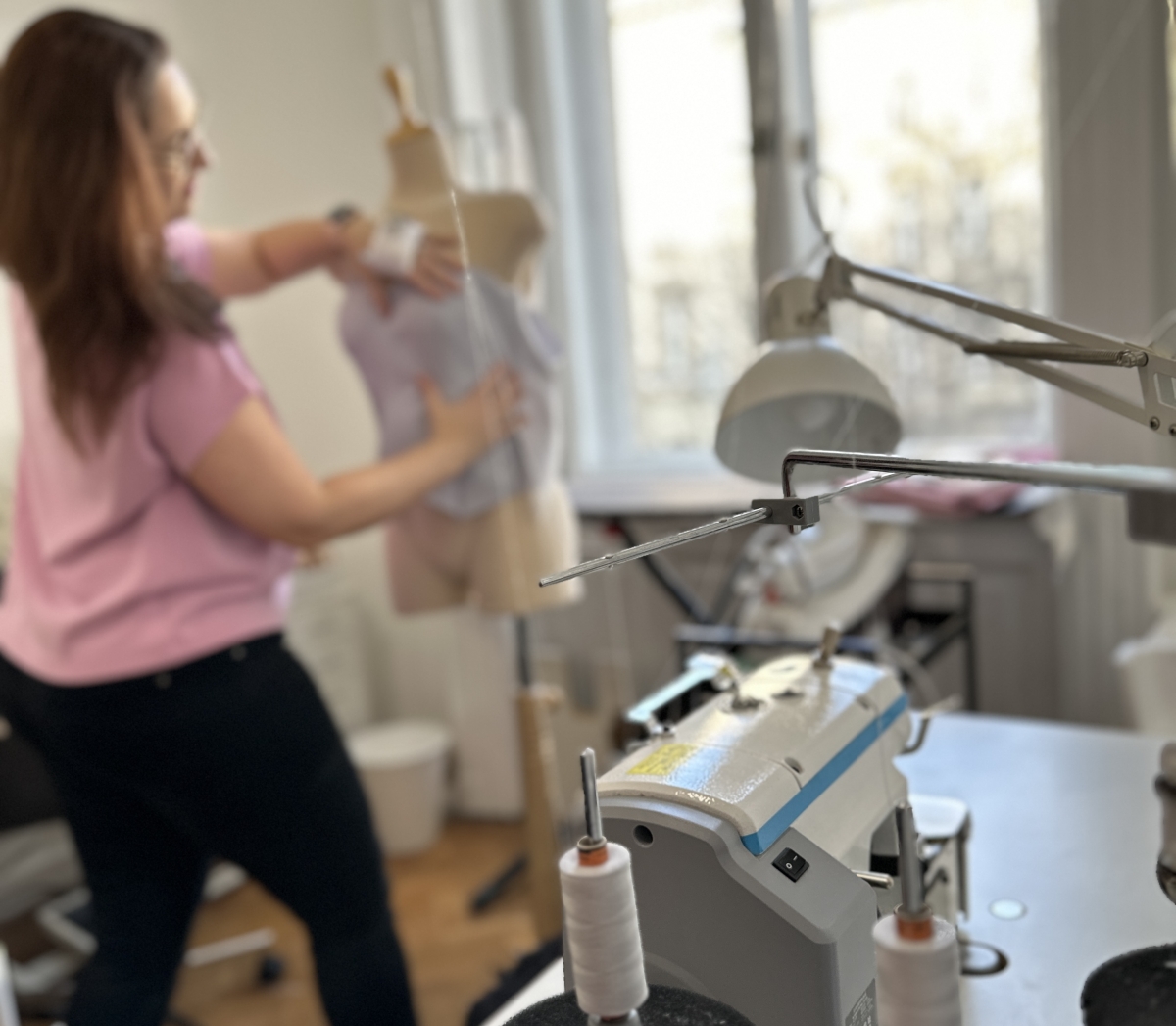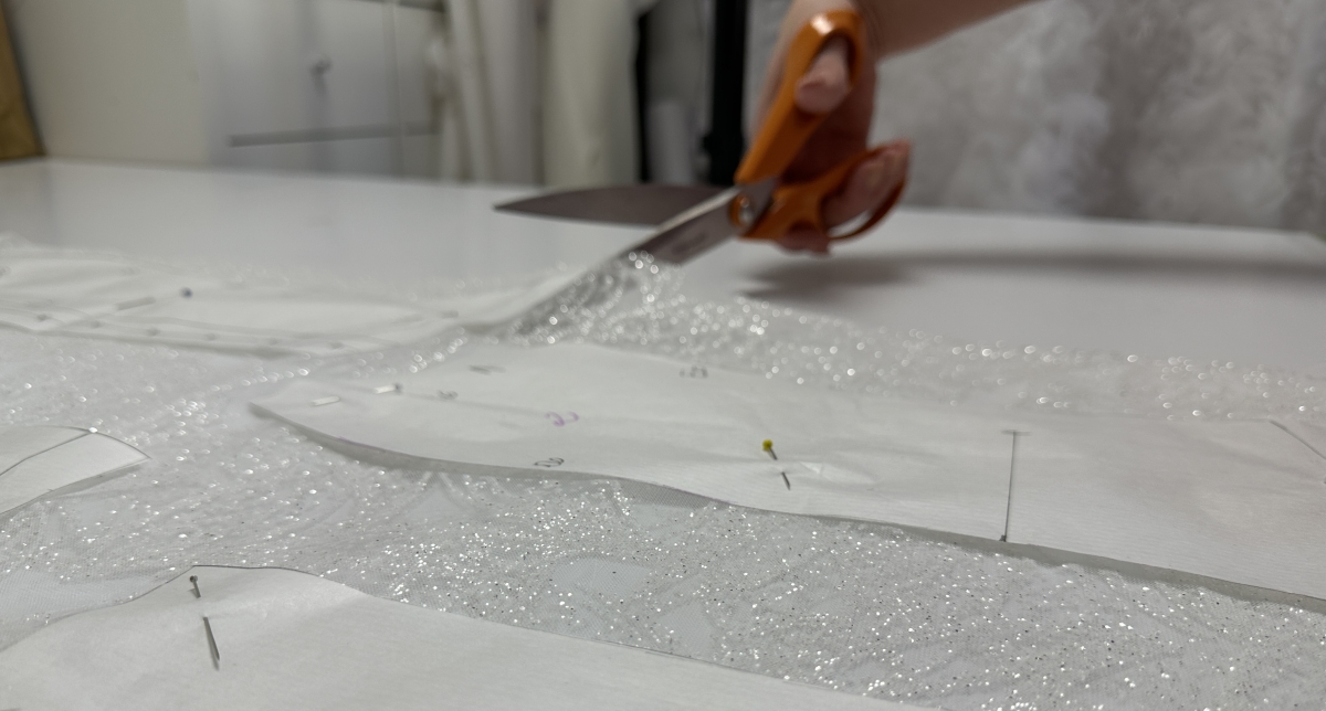 Én ilyen egyszemélyes, de öt varrónőnek is elegendő gépparkkal rendelkező műhelyt még életemben nem láttam. Ez egy varrógép-mennyország, egy szabászat-szentély. Brigi mérnöki pontossággal rajzolja a szabásmintákat, számol, nyilaz, hozzátűz. Azt meg leszámolni is nehéz, hogy hány szállal kattog az interlock, négy-öt, ki tudja, oly sebesen suhan a gép a keze alatt. Aztán ollót ragad, omlik ketté a selyem, mint vajban a kés. Kis gombostű sündisznójával a csuklóján jár a keze, avatatlan szemnek követhetetlen, biztos, stabil mozdulatokkal vág, tűz, csavarint, ölt, aztán babára „dob”, és ott ragyog előttünk a két hét múlva ceremónián debütáló menyasszonyi ruha.